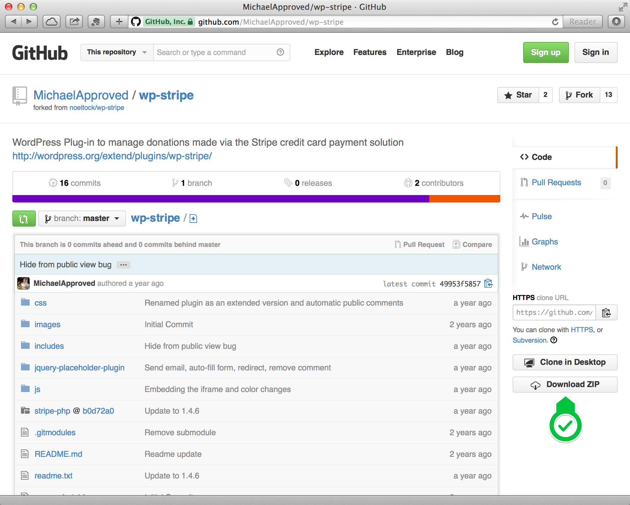 Go to Michael Khalili’s WP Stripe Extended GitHub repository and download the ZIP archive. The “Download ZIP” button is on the bottom right of the page. It’s free and you don’t need an account.